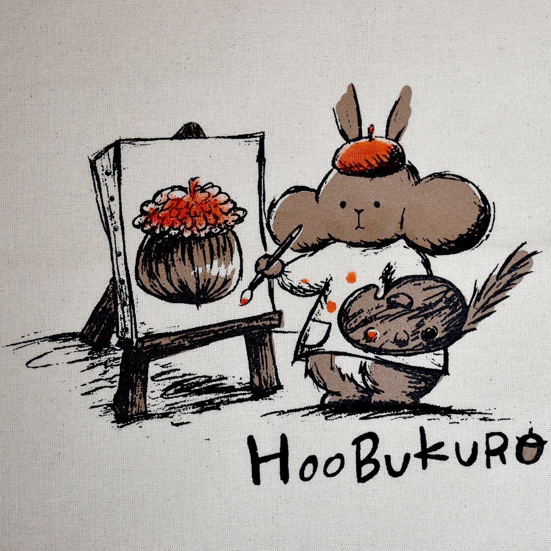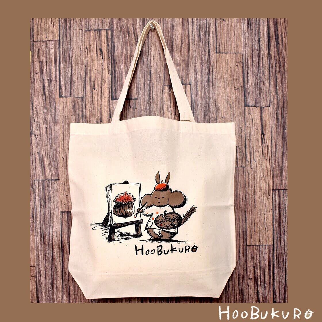 HOOBUKUROのロゴのリスさんが絵を描いているイラストを手刷りでプリントした軽い生地のトートバッグです。