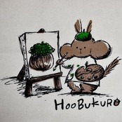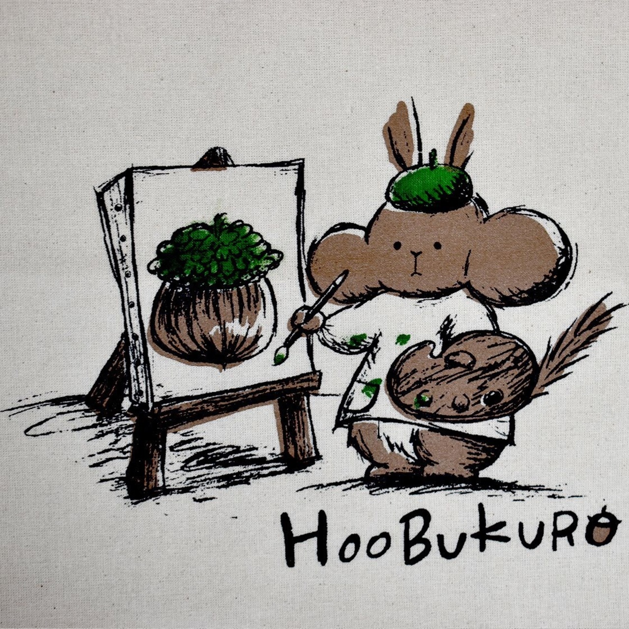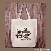 HOOBUKUROのロゴのリスさんが絵を描いているイラストを手刷りでプリントした軽い生地のトートバッグです。